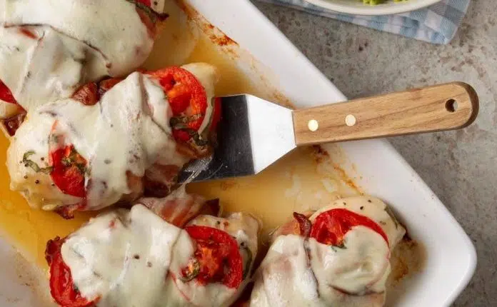 ژامبون دودی، ریحان تازه، گوجه فرنگی رسیده، و موزارلای آب شده و دلپذیر بر روی این غذا، تصویر جذابی از کاپرزه مرغ با ژامبون گوشت را خلق میکنند. عطر این غذا مانند طعماش فوقالعاده وسوسهانگیز است!