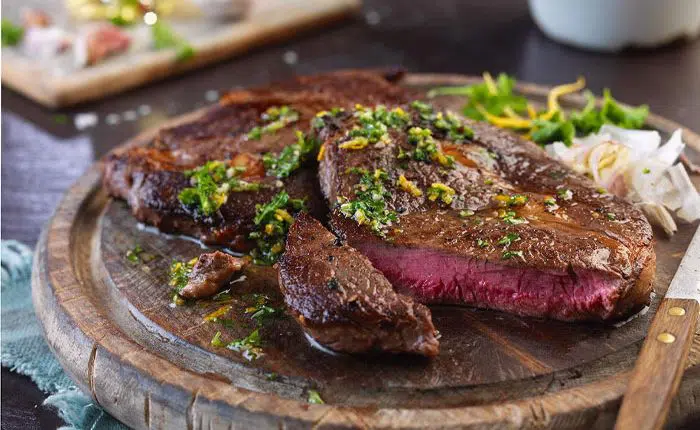 ب. گوشت را از داخل ماریناد بردارید و مواد اضافهی چسبیده به سطح آن را پاک کنید. آن را روی شعلهی متوسط گریل کنید تا به میزان دلخواهتان بپزد. برای تنظیم میزان پخته شدن گوشت میتوانید درجهی حرارت گریل را از ۵۷ تا ۶۲ درجهی سانتیگراد تنظیم کنید. البته در این دما، گوشت نیمپز میشود و ممکن است مناسب ذائقهی ایرانیها نباشد. شما میتوانید درجهی حرارت را بالاتر ببرید. هر طرف از گوشت را باید به مدت ۶ الی ۸ دقیقه حرارت دهید. در نهایت، ۵ دقیقه صبر کنید، و سپس آن را به صورت نازک برش بزنید. این استیک را میتوانید با باقیماندهی ماریناد نوش جان کنید.
